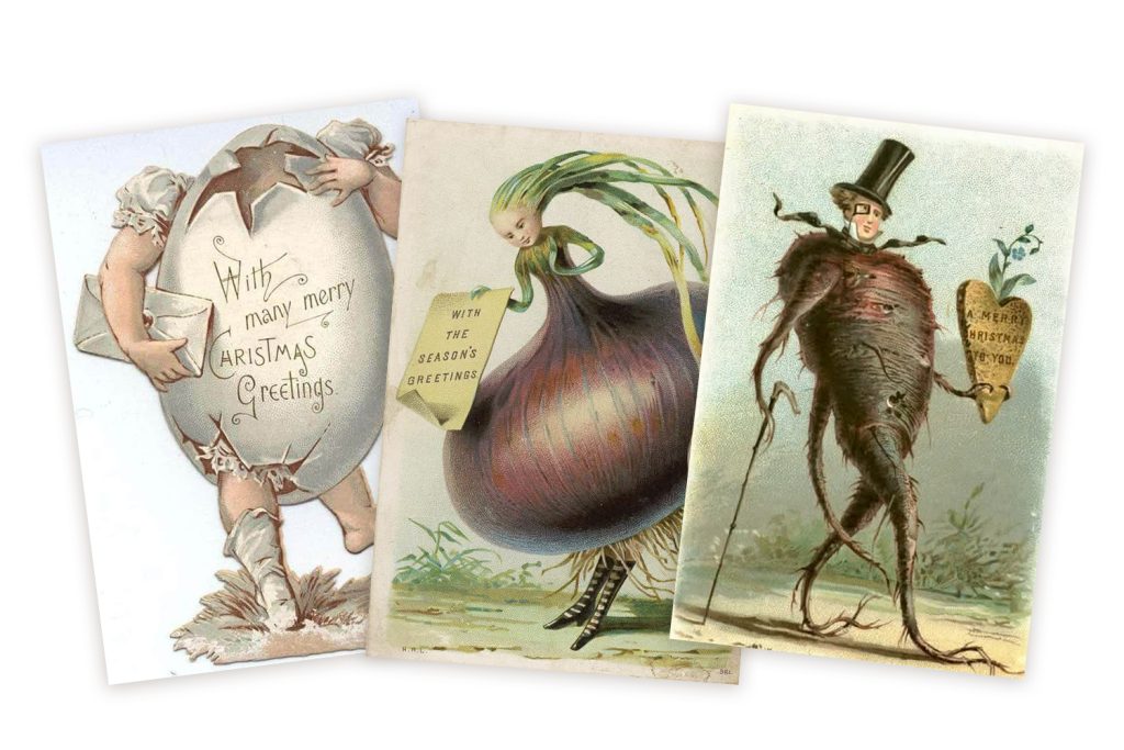 A viktoriánus korban a karácsonyi üdvözlőlapok tele voltak groteszk, bizarr és morbid jelenetekkel — és pont ez adja a varázsukat. A gyakoribb karácsonyi motívumok a növény- és állatvilághoz, a szezonális karcolatokhoz és tájképekhez kapcsolódtak. Így a fej nélküli törött tojás kisbaba végtagokkal, a zöld hajú hagymalány, illetve a béka és szarvasbogár ünnepi tánca a legnépszerűbb főszereplőkké léptek elő a korabeli képeslapokon. A ma talán szokatlannak tűnő érzelmeket és mintákat gyakran a szerencse jeleinek tekintették, míg más illusztrációk babonákon alapultak. A workshop házigazdái, Berta és Dani, az esemény kapcsán, egy kis kedvcsinálóként készítettek magukról is egy-egy félig zöldség, félig ember portrét. A karácsonyi retek és krumpli pedig többek között olyan kérdésekre is válaszolt a velük készült mini interjúnkban, hogy mi volt az eddigi legfurcsább karácsonyi ajándékuk: