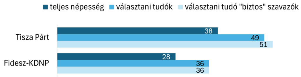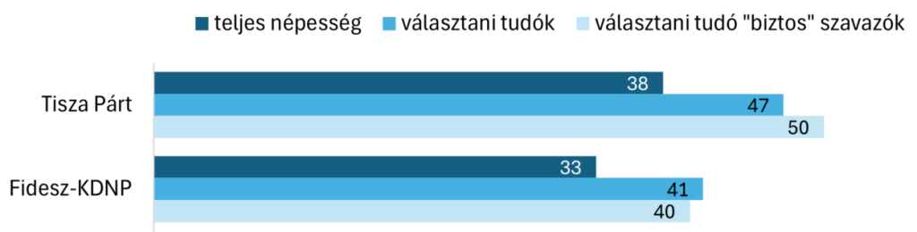 Tehát öt és fél hónap alatt 15-ről 10 százalékpontra csökkent a Tisza előnye a választani tudó „biztos” szavazók körében.