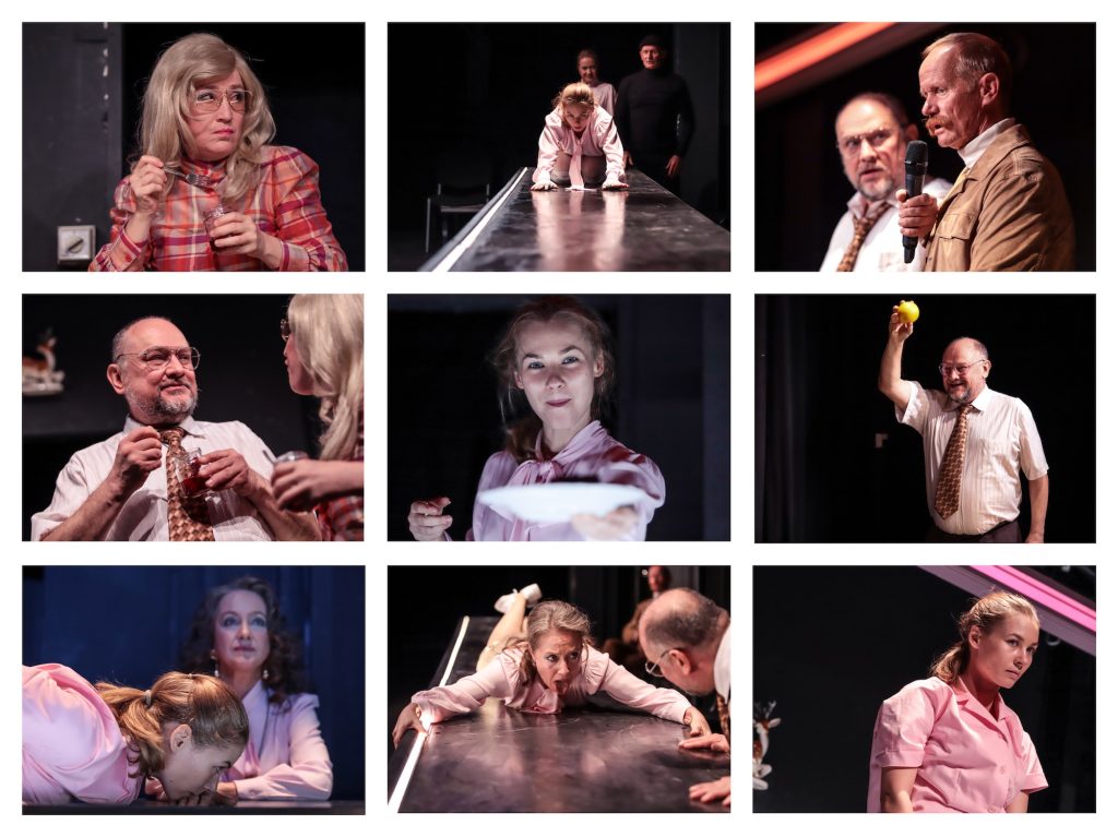 A történetet ismerjük. Az elején ugyan még egy tyúkot sem tud levágni Anna, de annyira embertelenül bánnak vele, hogy a végén, teljesen kifordulva emberi lényéből, hidegvérrel és tucatnyiszor mártja a kést ízibe Vizybe (mea culpa) és hisztérikus nejébe. Zsigmond Emőkét a Az üvegbúra című darabban tényleg féltettem, táncos fizikumára ebben az előadásban is szüksége van, a keserves takarítási folyamatra utaló, kígyózó húzódzkodása az asztalon és az alatta négykézláb történő somfordálása megterhelő fizikai „mutatvány” lehet.